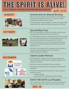 In October 2024, Our Saviour’s Lutheran Church (OSLC), was awarded $1,244,440 grant by Lilly Endowment Inc. to support a new program called “Praying in the Spirit: Nurturing Children in Three Communities, One Neighborhood.” The program serves as a model of collaboration and creativity in faith formation with three participating churches from the Phillips neighborhood of Minneapolis: OSLC, All Nations Indian Church (ANIC UCC) and San Pablo’s / Saint Paul’s Lutheran Church (SPLC). Together, we are all working to extend the Good News of God in diverse cultural, linguistic, and socio-economic contexts.